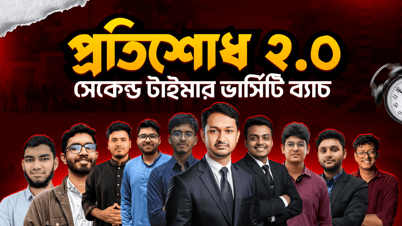 প্রতিশোধ ২.০ Second Timer Varsity Courseপ্রতিশোধ ২.০ আমাদের পূর্ববর্তী সফল কোর্স "প্রতিশোধ ১.০"-এর একটি উন্নত ও পরিমার্জিত সংস্করণ। এই কোর্সটি বিশেষভাবে প্রস্তুত করা হয়েছে সেকেন্ড টাইমার শিক্ষার্থীদের জন্য, যেখানে আমরা প্রতিটি শিক্ষার্থীর একাডেমিক অগ্রগতি নিশ্চিত করতে সর্বোচ্চ গুরুত্ব প্রদান করি।- 150+ classes - unlimited archive exam-10+ expert teachers -24/7 telegram mentorship - অধ্যায় ভিত্তিক ও ভার্সিটি ভিত্তিক ডেইলি এক্সাম -Varsity ভিত্তিক মডেল টেস্ট- ফুল সিলেবাস কয়েকবার রিভিশন - ভার্সিটি ভর্তিপরীক্ষা অনুযায়ী স্পেশাল গাইডলাইন- প্রতিশোধ ১ এর সকল আর্কাইভ ক্লাস , ও সকল মডেল টেস্ট আর্কাইভ এ